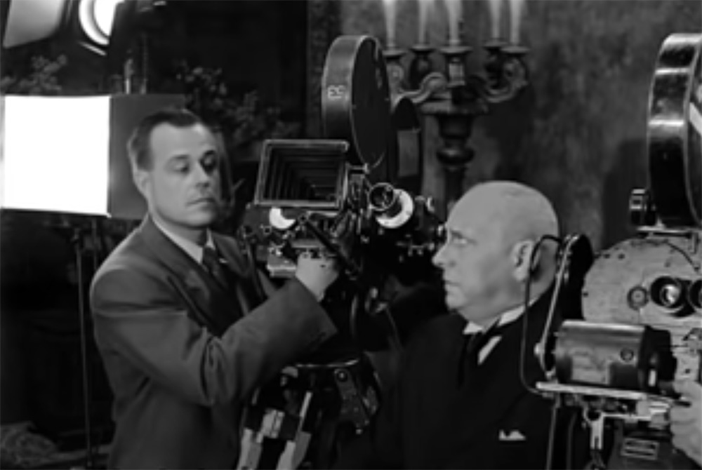As the parentheticals subtly indicate for this section of dialogue in Sunset Blvd., Max should look at the cameramen to give his instruction.